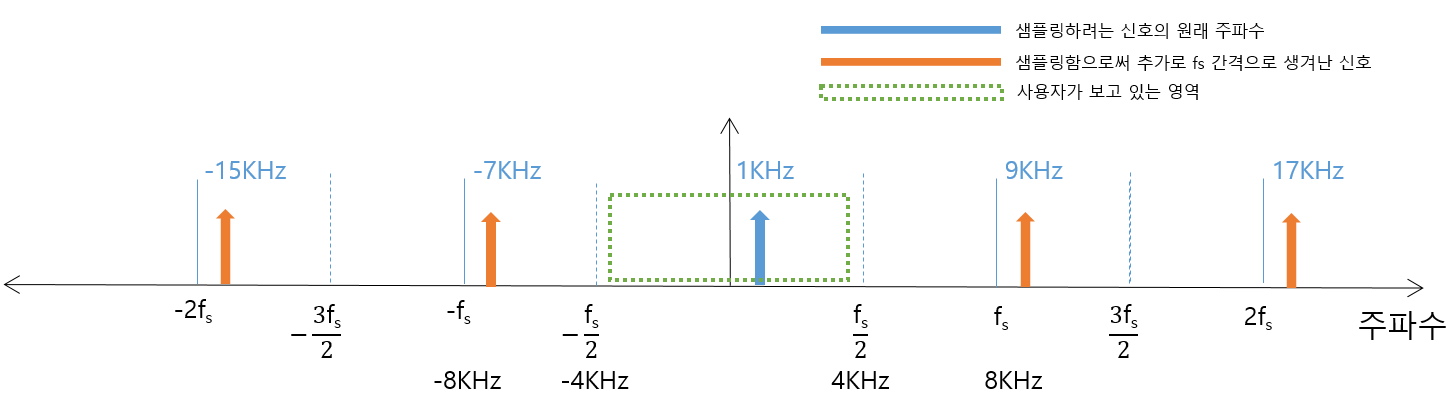 1KHz 신호를 8KHz로 샘플링한 이산화 디지털신호의 주파수 domain 을 보면 -7KHz[=1KHz -fs(8KHz)] 위치에 1KHz 신호의 성분이 위치한 것을 볼 수 있다. 1KHz 신호는 -7KHz 뿐만 아니라 8KHz[=1KHz+fs(8KHz)]에도 위치한다.