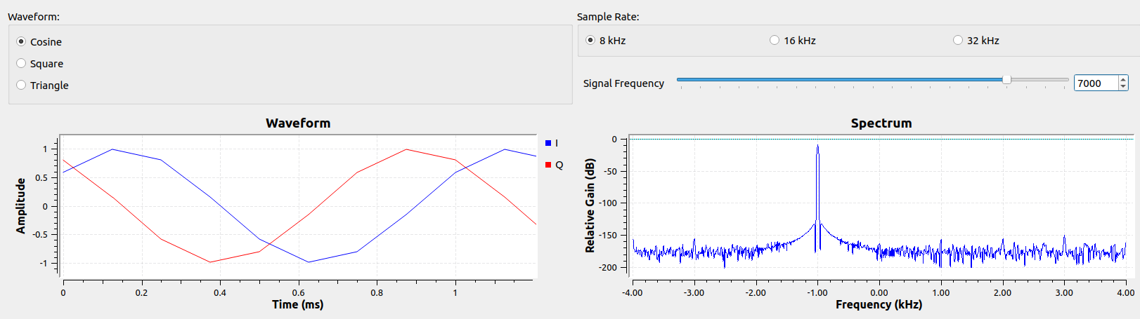 그림 2는 7KHz 신호를 8KHz 로 샘플링한 것이다. 그림 2에서는 Aliasing이 발생한다. 시간영역 그림을 보면 1ms의 주기와 같은 것을 볼 수 있으며 (실제로는 7KHz 신호인데 ! 말이다.), 주파수 영역의 결과를 보더라도 -1KHz 주파수를 가진 복소수 신호로 표현이 된다. 7KHz의 이산화 된 디지털 신호를 얻기 위해서는 8KHz의 샘플링 rate가 부족하다는 이야기이다.