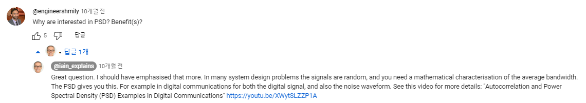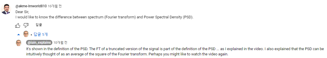 power spectral density는 auto correlation 함수를 fourier transfrom 한것과 같다. 이것을 설명한 영상이다.