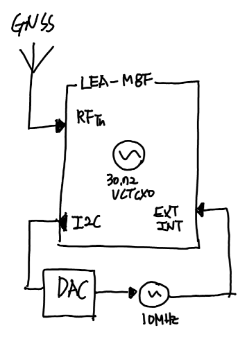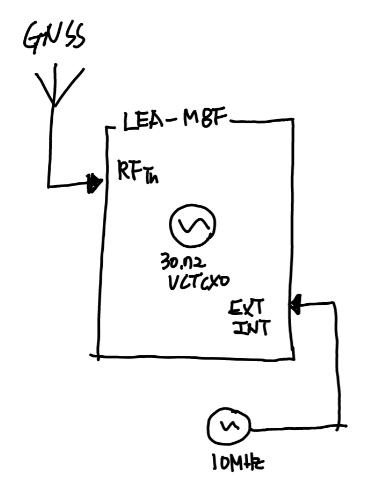 두번째 구성은 다음그림과 같다. 방금과 다른 것은 LEA-M8F 외부에 10MHz oscillator(ext osc)가 연결되어 있다는 점이다.