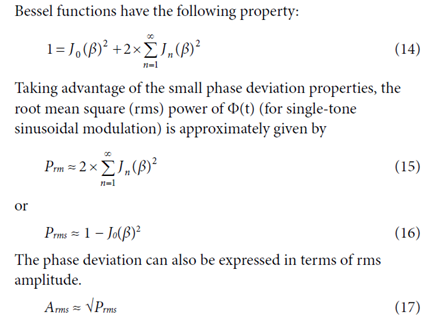 Bessel 함수 특성을 이용하여 phase noise rms 크기를 다음과 같이 계산할 수 있다. phase noise의 power는 신호의 전체 power 중 carrier 신호의 power를 뺀 나머지이다.