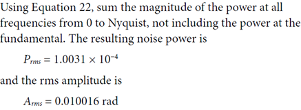 위 상황은 phase noise의 modulation 기본 주파수가 1개인 경우이지만, 이것보다 더 복잡한 경우가 있다. 이런 경우 phase noise의 rms power를 스펙트럼 domain에서 계산할 수 있다.