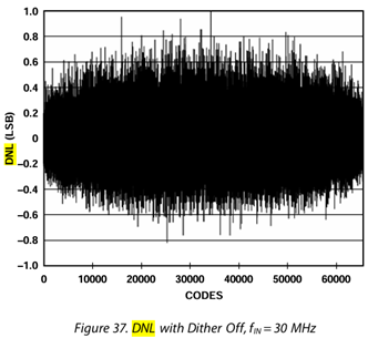 DNL은 SNR과 SFDR 성능을 떨어뜨릴 수 있다. 이상적인 ADC는 양자화 잡음만 존재한다. 이 잡음은 랜덤이므로 SNR만 제한한다. DNL이 존재하여, 코드 폭이 균일하지 않으면, 양자화 오차가 입력과 상관되어, 추가적인 잡음 성분과 주기적인 오차에 의한 Spur성분이 생긴다. 즉 DNL이 랜덤적이라면 Noise floor가 상승하여 → SNR 감소한다. 또한 DNL이 주기성을 가진다면, Spur가 발생하여 SFDR 감소한다.