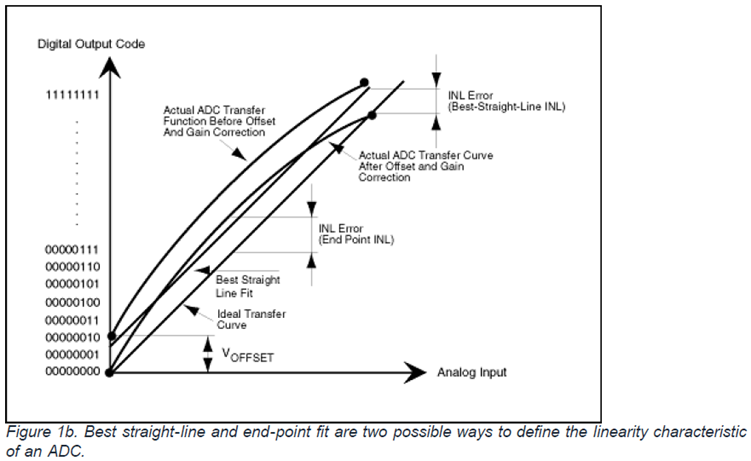 Best straight-line 직선의 첫번째 디지털 출력 값은 gain 오차(V offset)를 가지고 시작한다. 보통 Best straight-line 기준 INL 측정 방법이 일반적으로 사용된다.