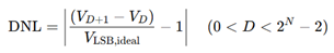 DNL (Differential Nonlinearity)은 인접한 두 코드 사이의 간격이 이상적인 1 LSB에서 벗어난 정도