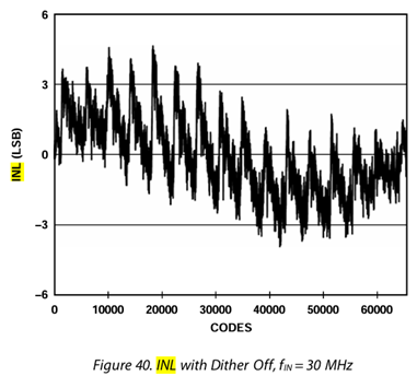 위 그림은 16bit AD9652의 DNL 특성이다. 65536개의 디지털 코드 값을 생성할 수 있다. 각 코드값 마다 DNL이 표시되어 있다. 각 코드 값마다 1을 증가시킨다면, 이 때 필요한 1LSB 전압이 이상적인 1LSB 전압보다 얼만큼 벗어나는지를 확인할 수 있다.
