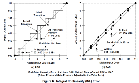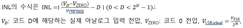 INL (Integral Nonlinearity)은 ADC의 실제 전달 특성이 이상적인 직선(transfer function)에서 벗어난 정도, DNL 오차가 누적된 것이 INL