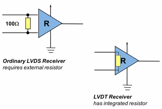 LVDS 신호를 지원하는 chip들의 데이터시트에서 LVDS 신호를 수신할 때 어떻게 회로를 구성해라 라고 쓰여있다. 주로 다음 형태의 LVDS 신호 송수신 구조가 언급이 된다.