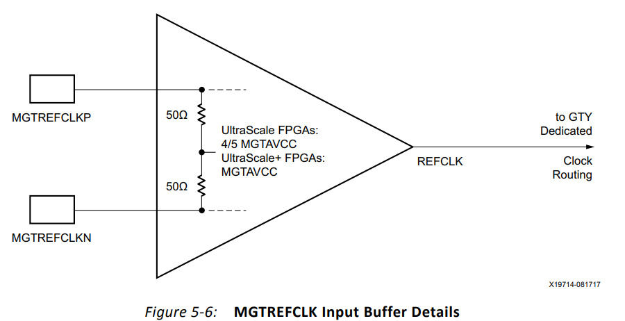 다음 예시는 LVDS 신호가 receiver에 도착하였을 때, receiver가 수신한 신호의 공통모드 전압에 대한 것이다. 아래 예시는 Xilinx사의 Ultrascale 계열 FPGA의 LVDS 수신부이다. 이 경우 공통모드 전압은 FPGA의 MGTAVCC라는 pin에 인가된 전압값으로 결정된다.