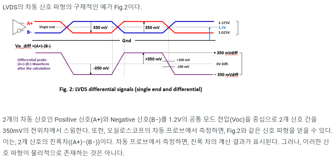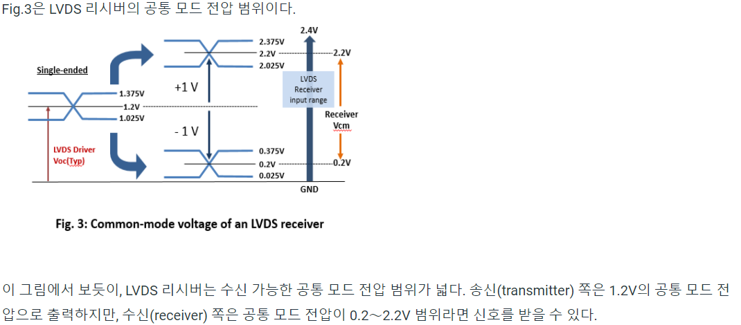 또한 위 그림에서 보면 공통모드 전압이 있다. 이것 또한 궁금했었다. 보통 LVDS 신호를 송신할 때 350mV의 차동신호만 보내는 것이 아니라, 전압이 일정한 공통모드 전압을 중심으로 350mV의 진폭만큼 신호가 Swing하는 형태로 보낸다.