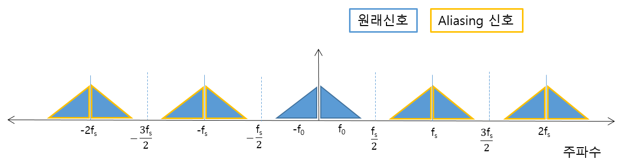 다음과 같이 원래신호뿐만 아니라, 원래 신호의 aliasing 신호들이 반복적으로 fs 간격마다 표현된다.