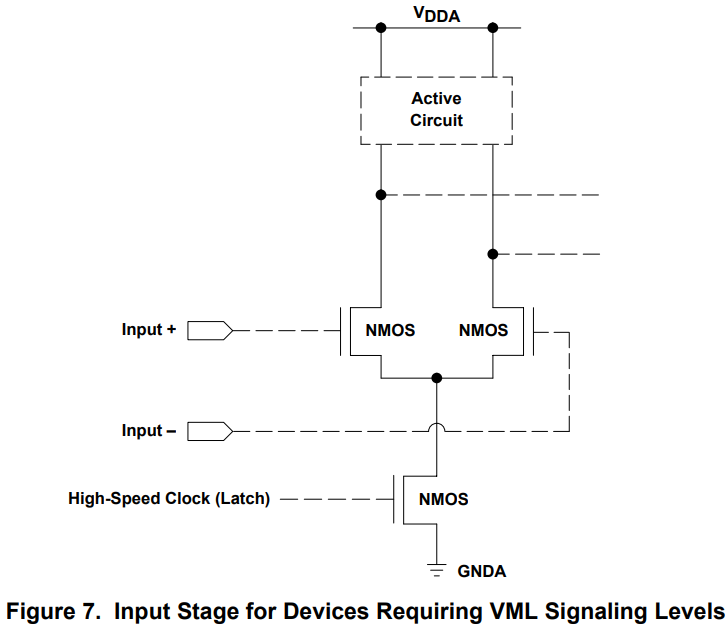 Similar to the CML receiver, the input stage for devices requiring VML signaling levels consists of a differential pair using NMOS transistors and the inputs (Input+ and Input–) need pullup resistors to the common-mode voltage of the receiver.