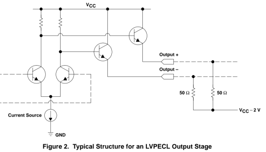 The typical output of an LVPECL driver consists of a differential pair with the emitters connected to ground via a current source. This differential pair drives a pair of emitter-followers which provide the current to Output+ and Output–.