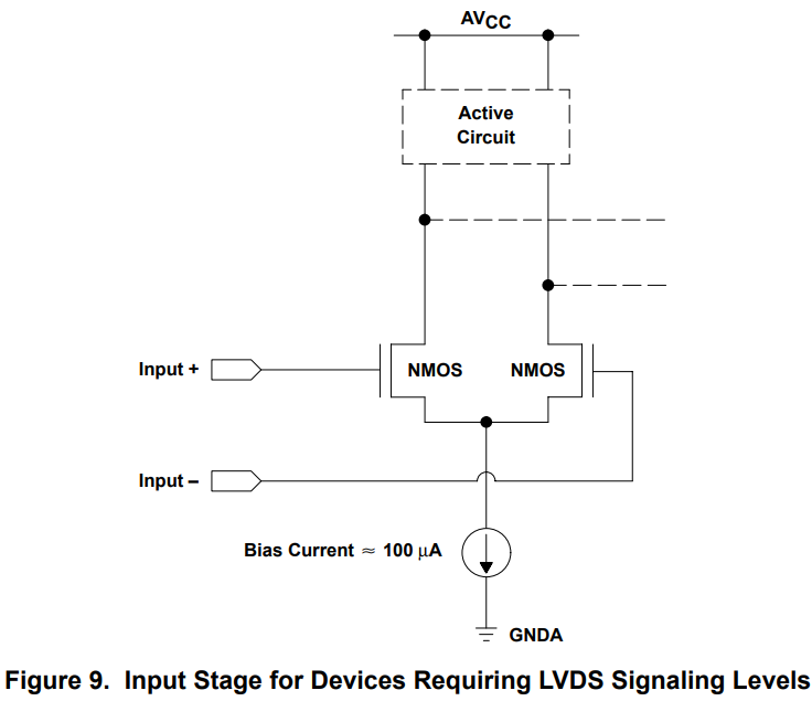 Where internal 100-Ω termination biasing is not included on-chip, this must be taken care of on the PCB, and the resistor should be placed as close to the device pins as possible. The current source attached to the drains of the NMOS transistors simply provides a small amount of current for the differential pair.
