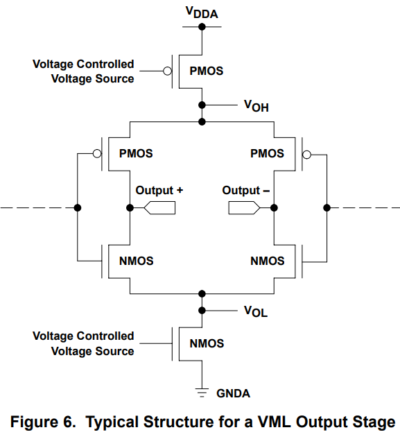 The LVDS output stage is similar to the VML driver except that Texas Instruments LVDS SERDES output structures use a feedback loop to regulate the common-mode output voltage of the driver.