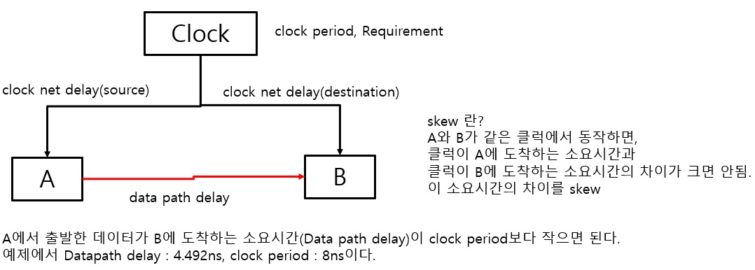 timing error 디버그를 위한 Skew, slack에 대한 이해 FPGA 합성시 Timing error에 대한 내용을 분석해야할 필요가 있다. 이때 skew와 slack 용어에 대한 이해를 위해 정리하였다. A에서 출력한 데이터가 클럭 1주기 안에 B에 도착하면 된다. 예제의 경우 slack이 여유가 있기 때문에 data path delay가 더 길어도 된다. FPGA 합성 시 slack이 – 값이 되면, 경고 메시지가 뜬다. FPGA - 프로세서 그리고 데이터의 이동 2023.04.04